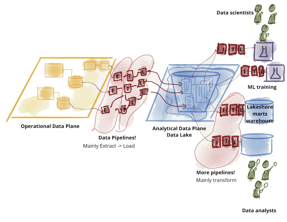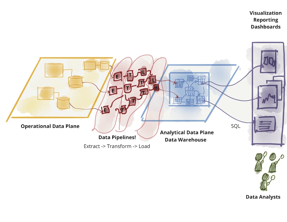 目前的技术、架构和组织设计反映了这两个数据平面的分歧——两种存在层面,虽然集成但又是分离的。这种分歧导致了脆弱的架构。对于许多试图连接这两个平面的人来说,持续失败的ETL(提取、转换、加载)作业和日益增长的复杂数据管道迷宫,是一个熟悉的景象,数据从操作数据平面流向分析数据平面,然后再流回操作数据平面。