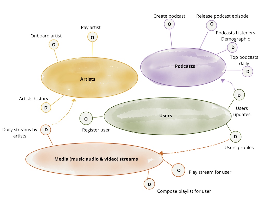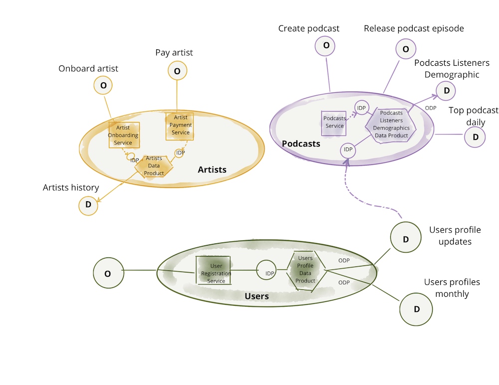 在本文中,我将继续使用原始文档中的相同用例——“一家数字媒体公司”。可以想象,媒体公司根据领域如“播客”(管理播客发布及其主持人的团队和系统)、“艺术家”(管理艺术家入职和支付的团队和系统)等,划分其运营以及支持运营的系统和团队。数据网格主张,分析数据的所有权和服务应尊重这些领域。例如,管理“播客”的团队在提供发布播客的API的同时,也应负责提供随时间变化的“已发布播客”的历史数据,以及其他事实,如随时间变化的“听众人数”。有关此原则的更深入探讨,请参见面向领域的数据分解和所有权。