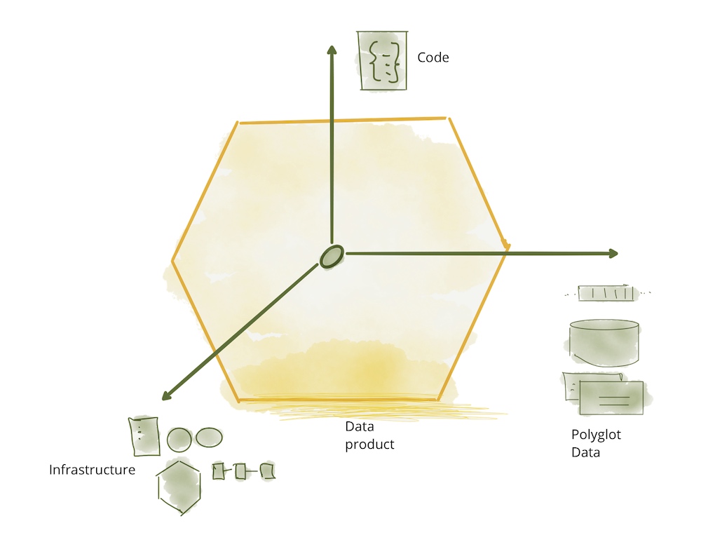 注意:数据网格模型与过去的范式不同,过去的范式中管道(代码)作为独立组件从它们产生的数据中管理;而且基础设施,如仓库实例或湖泊存储账户,通常在许多数据集之间共享。数据产品是所有组件——代码、数据和基础设施——在领域有界上下文的粒度上的组合。
