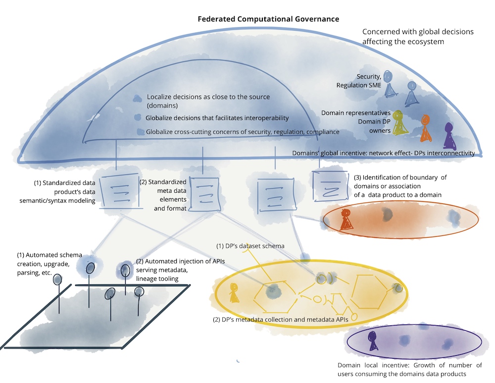如您所见,数据网格遵循分布式系统架构;一系列独立的数据产品,具有独立的生命周期,由可能是独立的团队构建和部署。然而,对于大多数用例来说,为了获得更高阶数据集、洞察力或机器智能等形式的价值,需要这些独立的数据产品进行互操作;能够关联它们,创建联合,找到交集,或在大规模上对它们执行其他图形或集合操作。为了使这些操作成为可能,数据网格实施需要一个治理模型,该模型拥抱去中心化和领域自主权,通过全球标准化实现互操作性,动态拓扑,最重要的是平台自动执行决策。我称这为联合计算治理。这是一个由领域数据产品所有者和数据平台产品所有者组成的联邦决策模型,具有自治权和领域本地决策权,同时创建并遵守一套全球规则——适用于所有数据产品及其接口的规则——以确保健康和互操作的生态系统。这个组织的任务很艰巨:在集中化和去中心化之间保持平衡;哪些决策需要本地化到每个领域,哪些决策应该为所有领域全球制定。最终,全球决策有一个目的,即通过数据产品的发现和组合创造互操作性和复合网络效应。