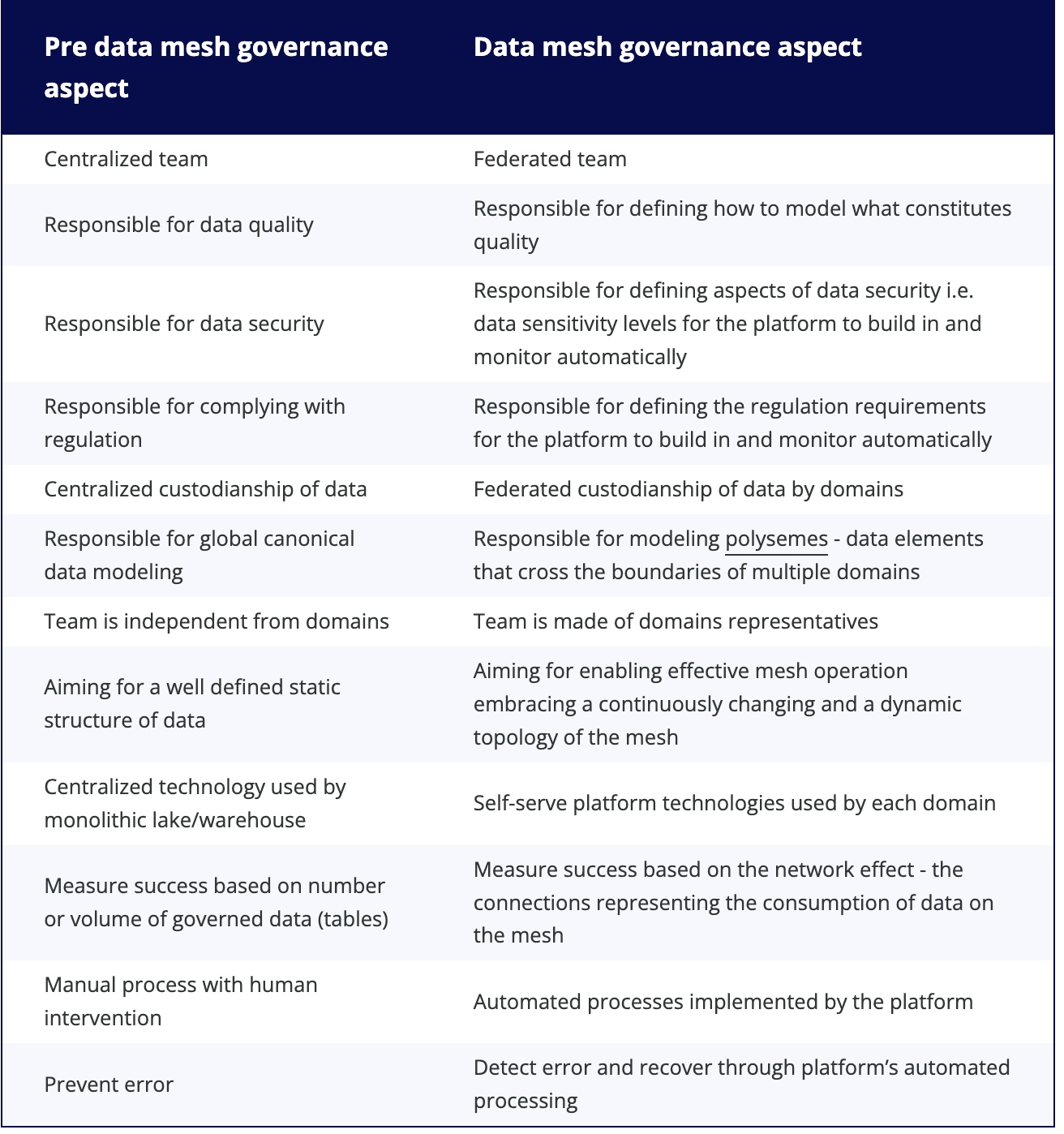以下表格显示了集中式(数据湖、数据仓库)数据治理模型与数据网格之间的对比。